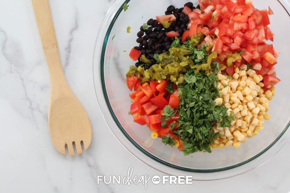 - Mix beans, cilantro, corn, diced tomatoes, diced avocado, diced jalapeño, and onions (if desired).